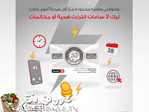 - ودلوقتى ولفترة محدودة مع أول شحنة أقوي كارت ليك 3 ساعات انترنت هدية أو مكالمات.