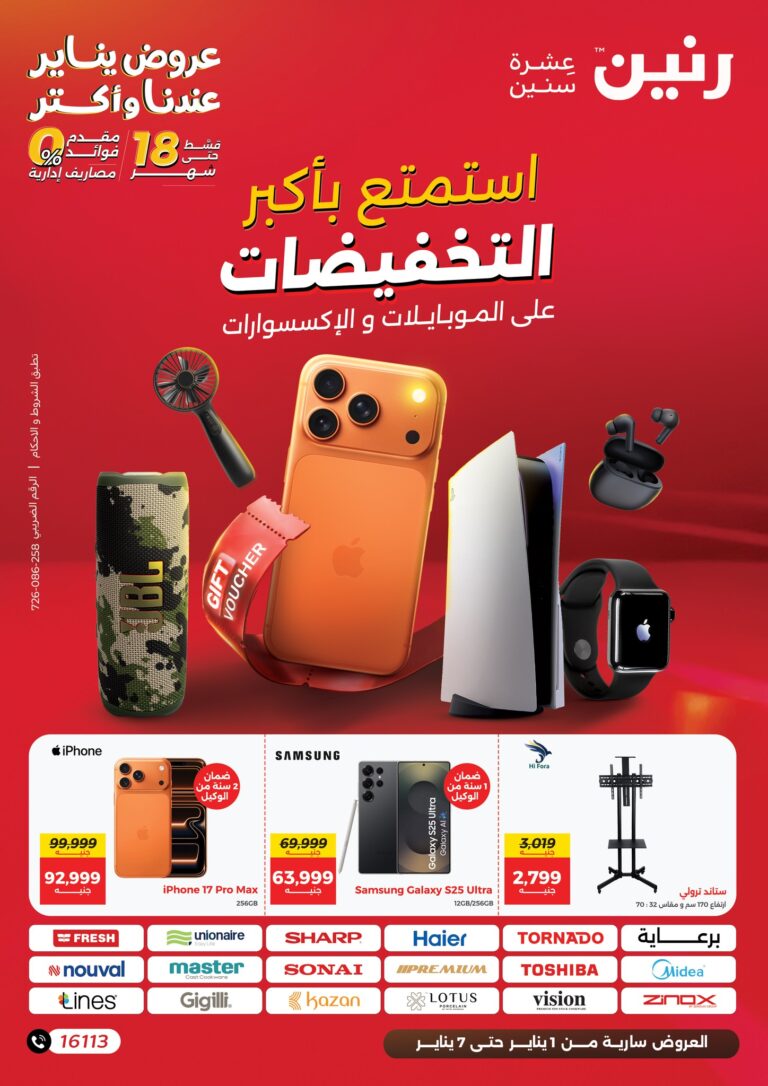 نستعرض معكم اليوم عروض رنين من 1 يناير حتى 3 يناير 2026، والتي تعتبر من أقوى العروض في مصر. شاهدوا معنا مجلة رنين للأدوات والمستلزمات المنزلية واستفيدوا من الخصومات الحصرية عبر موقع عروض نت.