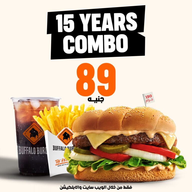 بمرور 15 سنة بافلو برجر عاملة كومبو الـ 15 سنة، اطلبه دلوقتى من الويب سايت أو الموبايل ابلكيشن بـ 89