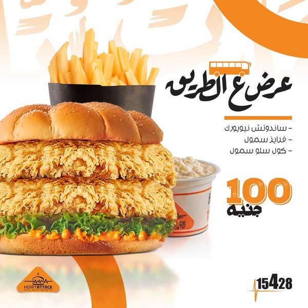 عرض ع الطريق : ساندوتش نيويورك، فرايز سمول و كول سلو سمول بـ 100 جنيه عرض ع القهوة : ساندوتش